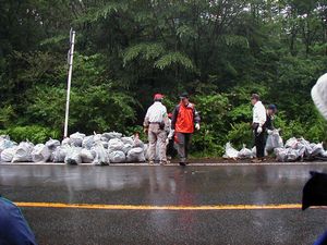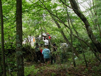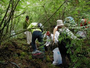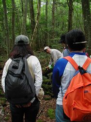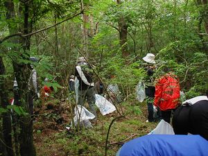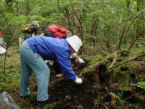 道路脇から樹海に少し入ったところが、目的で、インストラクタの方にゴミ袋を渡され、あまり奥に入っていかないようと注意を受け、目標の岩のようなものの周辺で作業をしてください。といわれました。