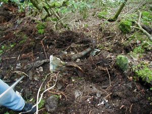 ベットのようなもの、古タイヤ、ブリキ板など。埋まっているジュースなどのパッケージで30年くらい前のものだとわかりました。丁度くぼみになっているところに、投棄して、うえからブリキ板などを乗せたようでした。