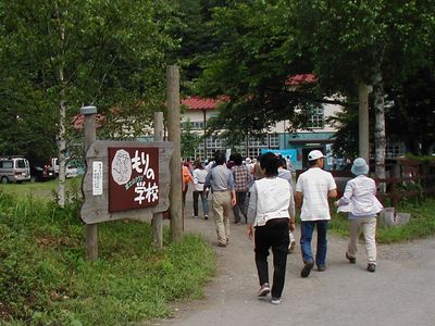 トイレを済ませバスに戻ろうとしたところ、降りたところにバスがなく、迷子になりそうでした。10時過ぎに河口湖ICを出て、10時30分ごろに「もりの学校」に無事、到着開校式が行われました。
