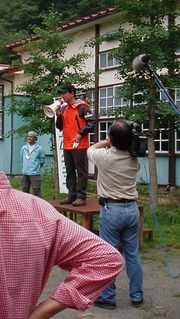 産経新聞の方の説明と、もりの学校校長:野口健さんのあいさつ、教頭の船津さんの説明