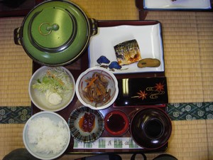 夕食のお膳です。 朝食のお膳、緑の鍋は、目玉焼きです。