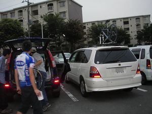コンビに前での積み込み(車を出していただいた皆さんありがとうございました。)