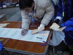 受付で、ゼッケンと計測チップを受け取り、自分で取り付けです。車検特にありませんでしたが、計測チップが正しく働いているかの確認だけでした。