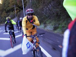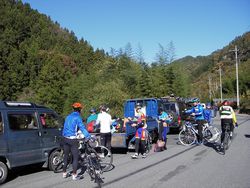 ゼッケンを左後ろにつけ、あとは、スタートのみです。 元気村したの道路脇で準備、朝食を取り、スタート地点に移動。