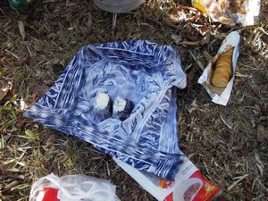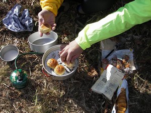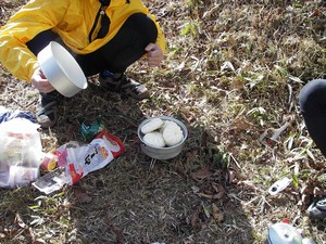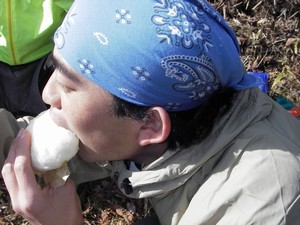 昼食タイム!! 肉まんです。師匠の蒸し器最高でした。おにぎりは、奥様の手作りです。