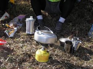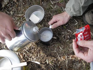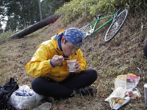 カップ麺、肉まん、甘酒、楽しい昼食タイム