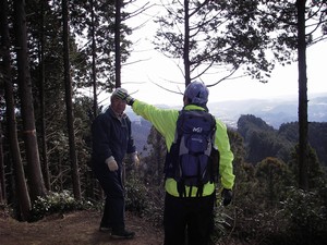 天覚山山頂近くで、地元のボランティアの方が、下刈りをしていました。Cr森さんが、地元の方の山々の景色を聞いています。