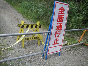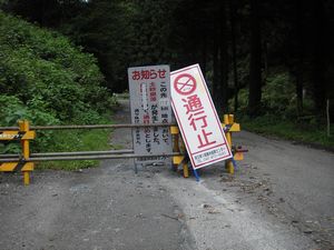 ゲート前の情報版です。全線通行止め、崩落写真と、ほぼ全線携帯電話がつながらないことが表示されていました。