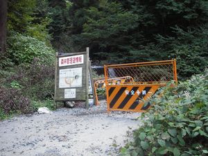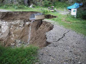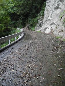 入口から700mくらいのところ崩落現場です。ブルーシートは、キャンプをしているいる人のものです。