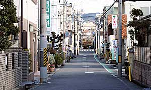 ⑩ 現在の様子(東より) 2025(令和7)年1月 並んでいた多くの商店が姿を消している。この通りの 南側(写真の左側)に市立藤井寺市民病院の跡地がある。 |