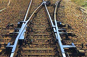 | 「横取り装置」とはどんなものか、各種サイトから仕入れた情報に基づいて紹介しておきます。「横取り装置」とは、駅構内の保線基地 などで、保線用車両が出入りするために設けられた特殊な分岐装置です。通常、分岐装置で進行方向を切り替える箇所をポイントと呼んで いますが、そこには可動式の切り替えレールがあり、線路が交わる部分には車輪のフランジ(車輪内側にある出っ張り)を通すためにレール に切れ目を設けた部分(クロッシング)があります。このクロッシングは保線上の弱点となっていて、分岐装置は時々交換が必要です。この 作業は保守作業でも手間の掛かるものなので、保線基地構内などでは横取り装置が用いられています。費用対効果の問題なのです。 本線(直進線)から分岐線に車両を進入させる場合、横取装置では、本線レールに乗越し形式のレール(渡り板)を取り付けて、その上を列 車が通過するようにします。言うなれば、「分岐用アダプターを使用して本線レールをまたぐ」というものです。本線レールをまたぐ部分 はレールの上にレールが載っている状態なので、ゆるやかな山なりに盛り上がった形状をしています。したがって、ここを通過する車両は 最徐行で運転されます。レールが載っていると言っても、レールの頭部分を少し薄くした程度の厚みです。 横取りレール(渡り板)は普段は裏返しの状態で線路脇や線路内に設置されています(写真JK)。分岐させる必要があるときだけ、手動で これを起こしてレールの上にかぶせます。横取り装置の使用によってレールをまたいで走行することが可能となり、本線上にクロッシング を設けることが不要となります。ただし、手動で操作するものなので、使用後には確実に渡り板をはずしておく必要があります。写真JK でわかるように、裏返し状態の時には白い裏面が見えています。渡り板が使用されていないことが遠目にもわかるように、裏面だけを白く 塗装して判別しやすくしてあるものと思われます。 以上が「横取り装置」の概要ですが、このような仕組みと用法を持つ装置なので、絶えず列車が通過するような輸送本線で使用すること はありません。したがって、普通の乗降駅ホームの近くで見ることもまずありません。道明寺駅ならでは見ることができるものです。 視覚的に横取り装置を理解していただくために、上のL図を作ってみました。典型的な横取り装置の例ですが、この場合、渡り板は3ヵ 所に設置されます。道明寺駅構内の場合もこのケースです。写真Mはネットに掲載されていた実際の横取り装置の使用例です。 |