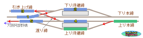 | I図で、1〜5の番号を付けた青色の列車が、藤井寺駅に到着 した下り普通列車の動きです。GIFアニメ「藤井寺駅の列車入 出線の動き」で順に動く様子を見ることができます。列車入出線 の動きをアニメの画面順に合わせて以下に記述します。 @ 下り普通列車が下り本線から下り待避線に入線 A 下り普通列車が下り待避線1番ホームに終点到着 下り準急列車が下り本線に入線 B 普通列車が引き上げ線に移動 準急列車が下り本線2番ホームに停車 C 普通列車が引き上げ線で待機 下り準急列車が発車 D 普通列車が引き上げ線から渡り線を通って上り本線に入線 |