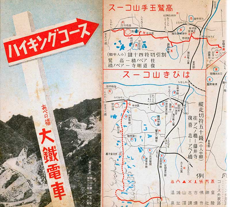 | 25) 大阪鉄道発行の『ハイキングコース』案内 表紙と案内地図の一部 〈昭和13,4(1938,9)年頃と思われる〉 |