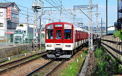 | 1) 大阪阿部野橋行き準急列車(西より) 南大阪線・土師ノ里駅東方。左手に見えるトラックの通る 道路は府道12号・堺大和高田線。 2017(平成29)年4月 |