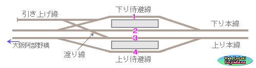 | C 藤井寺駅の構内配線の模式図 島式2面4線ホームで、南北にほぼ対称形の配置。 2本の島式ホームをまたぐ形で橋上駅があり、南北2ヵ所ずつ計4ヵ所の階段出入口がある。 下り待避線から引き上げ線が分岐している。引き上げ線は渡り線で上り本線につながっている。 |