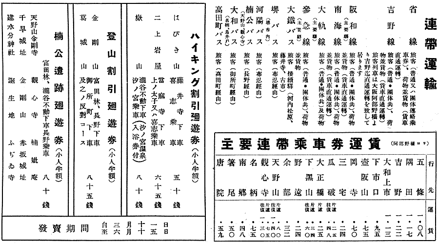 | 連絡線案内・連絡乗車券・回遊券 下の写真 30)は『沿線御案内』裏面の「旅客普通運賃表」の下にある案内です。「連帶運輸」は今日の「連絡線」で、接続する他社の鉄 道・バス路線のことです。連絡切符を発行して乗客の利便をはかりました。運賃欄の「一.〇八」は「1円8銭」、「.九五」は「95銭」を 表しています。 「省線」は国有鉄道の「鉄道省線」の略で、戦後の国鉄(日本国有鉄道 現JR)です。大鉄柏原線(現道明寺線)終点の柏原駅で関西本線に 接続し、御所線終点の御所駅では和歌山線に接続していました。下の運賃欄にある「五條・隅田」が和歌山線の駅名です。 「吉野線」は「大阪電気軌道吉野線」です。大阪鉄道は、新しい本線となる大和延伸線(現南大阪線)の開通と同時に、終点の久米寺駅か ら吉野鉄道(後の吉野線)に直接乗り入れる直通運転を行ってきました。その後吉野鉄道は大軌に合併されますが、吉野鉄道との直通運転契 約は継続されました。そういう経過もあってか、上の『沿線御案内』のように大鉄の路線案内地図では、吉野線も大鉄電車路線として表示 されていました。「吉野・大和上市・下市口・壷阪山・岡寺」が吉野線の駅名です。 「阪和線」は現在のJR阪和線ですが、当時は「阪和電気鉄道」という民営鉄道でした。昭和15(1940)年12月1日、阪和電鉄は南海鉄道 に吸収合併されて「南海鉄道山手線」となります。さらに昭和19(1944)年5月1日には戦時買収により国有化され、「国有鉄道阪和線」とな りました。起点の駅名も「阪和天王寺」→「南海天王寺」→「天王寺」と変わって現在に至っています。大鉄・大阪阿部野橋駅とは別駅で あった阪和鉄道線と連帯運輸をしていたことからすると、省線の関西本線・城東線(現大阪環状線の一部)とも大阪阿部野橋−天王寺で連帯 運輸をしていたと思われます。 「南海線」は「南海鉄道」で、現在の南海電気鉄道です。昭和19(1944)年に戦時国策によって関西急行鉄道と合併して「近畿日本鉄道」 となりますが、戦後に分離して南海電気鉄道となりました。連帯運輸の対象となった路線は「高野線」で、長野線の長野駅(現河内長野)が 南海長野駅に併設されていました。当時は「南海天王寺支線(廃線)」という路線があり、この路線とも天王寺で連帯運輸をしていたかも知 れません。 「大軌線」は「大阪電気軌道」で、後に大阪鉄道などと共に近畿日本鉄道を構成して行くことになる鉄道会社です。大鉄本線の終点であ る久米寺駅で大軌畝傍(うねび)線(現近鉄橿原線)と接続していました。畝傍線を経て奈良線(現近鉄奈良線)や桜井線(現近鉄大阪線の一部)に も乗り継ぎができました。 「参急線」は「参宮急行電鉄(参急)」で、大阪電気軌道が桜井線を三重県伊勢方面に延伸させるために設立した子会社です。参急線も現 在の近鉄大阪線の一部ですが、当時、大軌と参急は大阪上本町−宇治山田(現三重県伊勢市)間で直通特急電車の運行を行うようになってい ました。この路線にも連帯運輸によって乗り継ぎができるようになっていたことがわかります。参急は後に大軌と合併し、さらに大鉄や南 海などとも合わさって近畿日本鉄道の一翼となって行きます。 これらのほか、6つのバス会社が載っています。6者とも現在は存在しない名称です。「大鐵バス」は現在の近鉄バスで、「大正橋・三 宅・瓜破(うりわり)・下黒山・余部(あまべ)」などが大鐵バスの停留所名です。楠公バスは後に南海バスに買収されます。あとのバス会社について は、その後どう経過して行ったのかよくわかりません。 「廻遊券」の欄を見ると、発売期間が3〜6月となっており、この時期に集中的に利用者を誘致しようとしていたと思われます。ハイキ ングや登山の割引廻遊券の対象地域のうち、「はびき山」だけは現在ではハイキングの対象とはならない様子に変貌しました。二上山や嶽 山・金剛山・葛城山は、今でも都会に近いハイキングや登山の場として多くの人に親しまれています。 「楠公遺蹟廻遊券」では9ヵ所の名称が載っていますが、これらはかなり広範囲に分布しており、大鉄の下車駅からはバスを利用する所 も多くて、1日で全部廻るのは無理だと思われます。金剛山周辺が多いのですが、1ヵ所だけ離れた場所が「ふぢゐ寺」です。もちろん、 「葛井寺」のことです。ここには楠木正成(後述)にまつわる「旗掛けの松」があります。 |