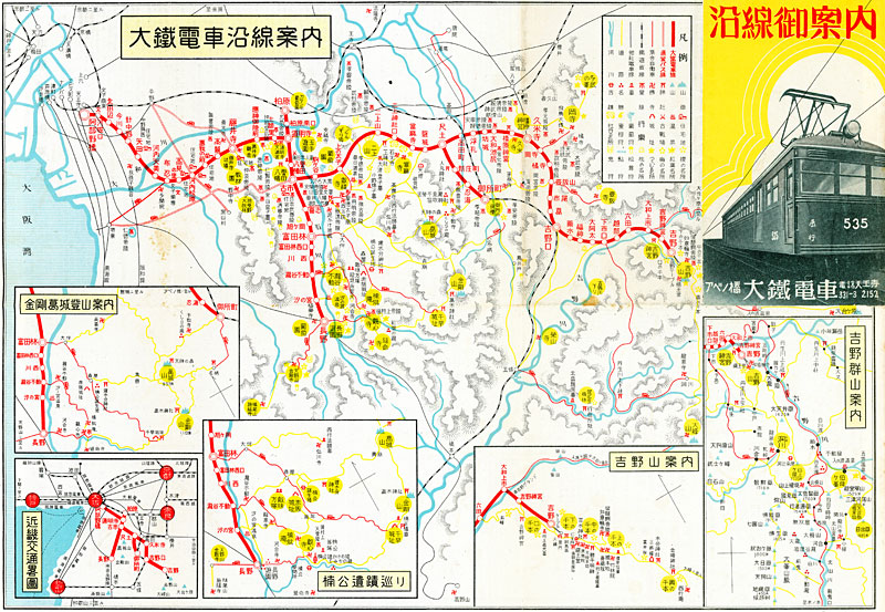 | 27) 大阪鉄道発行『沿線御案内』の表紙と沿線案内地図 〈昭和12,3(1937,8)年頃の発行と思われる〉 | |