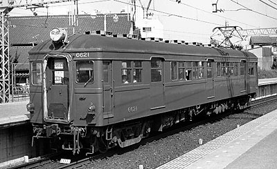 | 23) モ6601形の6621電動車 昭和46(1971)年10月 (近鉄南大阪線古市駅上り本線 南東より) 3扉化されているのがわかる。左側前面は吉野方向。 |