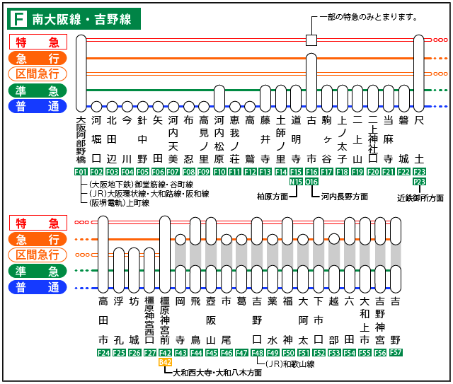 | 3) 南大阪線・吉野線の車種別停車駅と駅番号 | ||||||||||||||||||||||||||||||||||||||||||||||||||||||||||||||