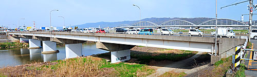 | 市内最大規模の橋 「新大井橋」は大和川に架かる橋ですが、藤井寺市内の大和川 ・石川に架かる橋の中では最大規模の橋です。長さ・幅員等の橋 の規模は上記の通りですが、片側2車線で東側に幅3mの歩道が 設けられています。橋を通過する道路は国道170号で、「大阪外 環状線」にも位置付けられています。藤井寺市の中央部を南北に 通過する幹線道路であり、東西幹線の府道12号堺大和高田線と交 叉する沢田交差点の近くには、西名阪自動車道の藤井寺インター チェンジもあって、170号の交通量はかなりのものです。さらに 市の南部では府道31号堺羽曳野線と交叉する野中交差点もありま す。また、大和川南岸の堤防道路も府道に制定されており、国道 には1日中多くの車が出入りしています。 |