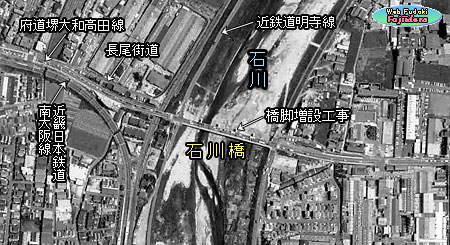 | 長尾街道が越える橋 石川橋は文字通り「石川」に架かる橋ですが、まるで石川の橋を代表しているような名前です。石川に架かる橋の中では最も下流に在る 橋です。石川は、石川橋の北方、約900m下流のところで大和川に合流します。石川は、北東側に隣接する柏原市との東の境界になってお り、石川橋も中央が境界となっています。現在藤井寺市内には大和川・石川に架かる橋が6ヵ所(高速道路を除く)ありますが、その中でも 石川橋は早い時期の明治6年に架橋されています。 大阪府の中央部よりやや南側で、奈良県に通じている東西向きの幹線道路として利用の多いのが、主要地方道の府道12号・堺大和高田線 です。この府道が石川を越える場所が「石川橋」です。堺市から東へほぼまっすぐ通り、藤井寺市を東西に通り抜けて柏原市に入り、そう して奈良県に入って行きます。堺大和高田線は、奈良県内でも「県道12号」に制定されています。 この府道堺大和高田線は、堺−当麻(現葛城市)をつなぐ「長尾街道」のバイパス道路として造られました。それまで、長尾街道の大阪府 内部分は「国分(こくぶ現柏原市)堺線」として府道に制定されていて、東西幹線として利用されていました。その長尾街道が現在の石川橋付 近を渡河していました。もっとも、明治の世になるまでは橋は無く、普通は渡し船が利用されたものと思われます。長尾街道の基だったと 言われる古代の官道「大津道」は、もっと北の方で東に直進していたそうなので、古代に石川を渡河していたのはもっと北の位置であった と推定されます。そして、石川を渡った所で北から南下して来る東高野街道と交わっていたようです。 現在の石川橋は府道堺大和高田線の開通に備えて1955年(昭和30年)3月にできていますが、堺大和高田線の藤井寺市域での全通は1958(昭 和33)年10月です。写真@が石川橋を西から見た最近の様子ですが、1955年の完成当初よりは幅員がかなり広くなっています。この路線は東 西道路が少ない中で利用度が高く、橋の西詰め・東詰めの交差点もあって朝夕の混雑が多いため、後に拡幅増設工事が行われて現在の姿に なっています。1984(昭和59)年、北側に新たに橋脚・橋桁を設置して東行き車線用の橋を設け、従来の2車線は西行き専用として右折レー ンが設けられました。右折レーンは橋の東端にも設けられています。どちらの交差点も右折方向の堤防道路の利用が多く、堺大和高田線渋 滞の大きな原因ともなっていました。北側新橋の増設に先立って、南側には柵で仕切った専用歩道が設置されました。橋桁を拡幅するため に橋脚上部に鉄鋼製の張り出し梁部を増設して歩道橋が架けられています。写真Cで、その橋脚や橋桁の様子を見ることができます。 歩道の増設と北側新橋の増設を行った結果、石川橋全体の幅員がずいぶんと広くなりました。写真Bが現在の石川橋の様子ですが、両岸 の堺大和高田線よりもかなり広い幅であることがわかります。架橋直後の時期である下の写真Eと比べると、ほぼ2倍の幅になっています。 |