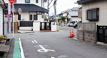 | 20) 当て曲げの現在の様子(北より) 西門のあった位置の西側にある当て曲げ。南北の 東高野街道は完全にずれている。 2025(令和7)年10月 |