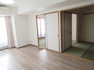 | LD入口から和室へ向かって | システムキッチンのアップ | 入口廊下からLD・洋室へ向かって |