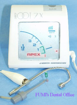 根の先端までの長さを測定します。いくつかの方法がありますが、電気根管長測定器(でんきこんかんちょうそくていき)がよく用いられています。