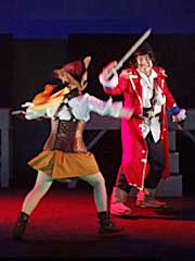 銃の音が響き明転。宇宙海賊スライスが登場。その後ろから女宇宙海賊ゾネスが銃を構えて登場。