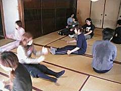 さて。まずは前半。いつものように『ウォーキング』からスタートします。泥んこの田んぼを歩いたり、宇宙空間を遊泳したり。実際は畳の上だけど、想像上の場所を歩いてみました。場所の設定によって、歩くときの身体の使い方が変わりますね。その後、設定を私が指示しないで、それでも全員が同じ場所を歩いているようにとお願いしました。リーダー役は決めないで、合図もしないで、相談もしない。勇気をもって誰かが歩き方を変える。周りをよく見て、場所が変わったのを察して、全員で同じ場所を歩く。このゲームは初めてでした。でもこういうの、私のワークショップではよくやりますね。ちゃんとオファーすること。相手や仲間を信頼すること。相手と合わせること。うん。よくやるよくやる。