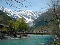 道中は長い。幸い本も持ってきているので、早速読書に没頭した。女「総務のHさん、GWに帰省するって言ってたよね。」男「ああ、そういえば、方向一緒か。」女「乗ってたらどうしよう。バレちゃうね。」ふむふむ、車内恋愛でまだ秘密だな。おっといけない、つい聞き耳を立ててしまった。・・・そんなこんなでずっと立ちんぼながら、2時間半はあっという間だ(ずっと聞いてたわけじゃないっすよ)。 松本駅から松本電鉄で新島々へ、さらにバスと乗り継いで上高地に着く頃には既に昼になっていた。春山の登山基地・上高地。雪に閉ざされた、とは言わないまでも、もう少しアルピニストの世界かと思ったが、完全に夏と一緒だった。おまけに今日はメチャメチャ暑い。河童橋の上は、「ここは原宿か!?」と言いたくなるほど人また人だ(原宿には滅多に行かないけど・・・)。長居は無用とばかり、徳沢園へと歩き始めた。 明神館までの道のりは観光客も多い。スカートの人、ハイヒールの人。どうも気分が台無しだ。「オイラは君たちとは違うんでぇ」とばかりに、靴紐も結ばず、ポケットに手を突っ込んで歩いて見たが、歩き難いことこの上ないのですぐ止めた。 |