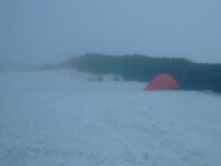 ![]() 雨と強風に晒された雪上のテン場 オレンジ色のフライがMyテントっす |