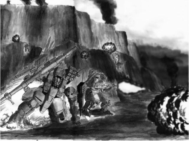 「AXIA PlanetCode D-041 vol.2 "What's AG?"」扉絵用原稿。これも薄墨で描画。 バックのディキシィ・ソードの体型がでっぷりとしてしまった。 それからマズルフラッシュの部分が明らかに失敗。これはインクをこぼしてしまって、時間が無いからホワイトで誤魔化した部分。コンピュータで描けばこういう事も無いんだろうが、当時はまともに画像加工できるスペックのパソコンを持ってなかったので手で描いてた。今でも手で描いてるけど……。 2001.01.31 Photoshopで、ぼかし(ガウス)加工を施してみた。 |