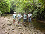 <<仲間川探検隊>> 仲間川源流にて南風パピヨンの仲間川源流カヌーツアーの参加者。 |