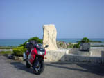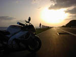 <<夕日とバイク乗り>> 名護市から瀬底島へ向かう途中、R58の未開通部分で撮影。コレ撮るのは結構苦労した。デジカメのタイマー時間が変えられないので、セットしてから立ち位置まで全力疾走で走った。 更に、カメラの反対方向を向いているので、何時シャッターが下りたか判らないので暫く立ちっぱなしという……。これを4回ぐらい繰り返した。 やっぱ、この手の写真は一人で撮るのは難しい(^^; |