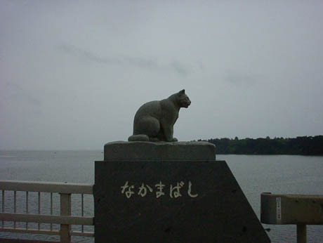 道からちょっと行ったところに、スオウが群生している場所があった。根が帯のようになっていて面白い。写真を何枚か撮ってからスクーターの所へ戻った。 更に湯布島方向へ走っていくと、川に掛かる小さな橋をいくつか渡る。川沿いにはマングローブが沢山生えている。今までテレビでしか見た事のない光景だ。おお、西表に来たんだゼ! こんな感じで、行く先々で感動してばかり。結局、湯布島に着いたのは16:00ちょっと前だった。で、牛車による湯布島渡りは16:00まで。ガーン。 呆然と立ちつくすオイラに追い打ちをかけるように、雨まで降り出した。ああ、ついてないなぁ。仕方ないので雨具を着込み、対岸から未練がましく湯布島を撮影する。つまんない絵だな……。なんだか虚しくなったので牛さんを撮影。 ここでボーッとしてても仕様がないので、来た道を戻る事に。そう言えば途中、自然センターなるものの看板を見かけたので、そちらへ行ってみる事に。で、行ってみたら開館時間は8:30〜16:30までとの事……。ついてない。泣けて来るんでこんな写真撮ったり。