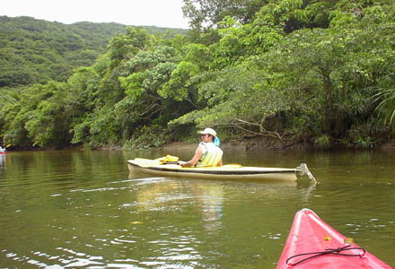 6:00起床。もう体調は絶好調。百歳まで長生きできる!(謎) 今日こそはカヌーに乗るのだ。朝食の後、山田さんと東荘の前で待っていると昨日と同じガイドさんがバンで迎えに来た。実はこのガイドさんが社長。というかカヌーショップの店長といったところか。 今日は手違いはなく、川登りもOKという事でバンに乗り込む。 今日の天気も晴れ。前日に東荘の女将さん聞いたのだが、4月中は雨が多かったのにここ数日で本当に天気が良くなったらしい。丁度オイラが沖縄に来たときに天気が良くなった訳で、本当に運が良い。いや、もはやこれはお天道様がオイラの為に顔を出しているとしか思えない! そんな天気。 程なく事務所に着く。そこで簡単な書類(万が一の時の連絡先と既往症がないか程度)を書いて待つ。申し込んでいた客全てが来たところで、ライフジャケットを着込んで再びバンに乗ってカヌー置き場へ向かった。 カヌー置き場は仲間川河口近くで、そこでガイドさんから簡単にパドルと舵の取り方を教わり、早々に出発。カヌーだけレンタルして好きに漕いで行く事もできるのだが、オイラは初心者なのでガイドさんに付き添ってもらうツアーを選んだ。 初めはの内は当然苦戦。まず上手くパドルが操れない上、カヌーが真っ直ぐ進んでくれない。舵の調整が上手くなかったのか、ちょっと足に力を入れただけで向きが変わってしまいジグザグに進む事になる。カッコつけて船体が短いカヌーを選んだのも、直進安定性を低くして曲がりやすくなってしまう原因だった。パドルの使い方が上手くなくてロスが有る上に、無駄な方向転換で力が使われるので進むのが遅い。その上、朝は引き潮だから海に向かう流れが強くて上流に進むのに力がいる。 山田さんはというと、流石に慣れたものでスイスイと進んで行く。しかしパドルを駆るその背が、何故だか物凄く嬉々としているように見える。進む速度も速くて、アッという間に姿が小さくなってしまう。オイラがチギれてしまうので、ガイドさんも慌ててちょっと待つように言う。 また、初心者のオイラは当然気が付かなかったのだが、水深が場所によって違うので気を付けないと座礁する。観光用の遊覧船が座礁しないように、水深の浅いところを示すフラッグが所々に立っていてガイドさんの指示に従ってコースを行く。河口付近は川幅も広くて全てが遠くに見え、本当に上流まで行けるのかと心配になったり。遊覧船が横を通り過ぎるときには波が立って揺らてアレレレレ。汗だくになりながら漕ぐオイラを見て、遊覧船の客が「ガンバレー」と声を掛ける。くそー、強がって笑顔で手ぇ振っちゃうぞ(^^; しかし、ヒイコラ言いながらも中流まで遡る頃にはコツが掴めてきて、それなりに漕げるようになってきた。疲れて余分な力が抜けた事と、リズムが大事だという事に気がついたからだ。それから、ガイドさんに舵も上げてもらい、方向転換はパドルで行うようにしたので余計な力がいらなくなったのも良かった。後で知ったのだが、本来、河を行くカヌーに舵はい要らなくて、基本的に方向転換はパドルで行う。海のように潮の流れがあって、船の向きを積極的にコントローする必要があるシーカヤックでは、舵の利点が大きいらしい。 何にしろ、余裕が出来て周りを見られるようになると楽しくなる。河幅も狭くなってマングローブ林を間近に見られるようになる。よく見ると沢山の動植物を見る事が出来る。干潟にはタンチョウの群がいて、マングローブの根の間に小さな魚が沢山居る。マングローブの生態が、テレビでなく生で見られるのが感動だ。水面に近い視点から見られるというのも良い。湿地だから陸から歩いてこのマングローブ林に近づくことは出来ず、川から行くしかない。また、ある程度遡ると水深が浅く、場所によっては十数センチというところもあるので遊覧船は河口付近しか回れない。この景色は、カヌーでしか見られないのだ!