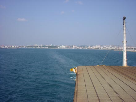 首里城の跡は国際通りに向かった。ここは那覇の繁華街で、沢山の店や市場がある。そして、小さな通りが縦横無尽に連なっており、歩くだけでも楽しめそう。 オイラは、お土産と昼飯を求めて中央市場に寄った。ここには海産物や沖縄の特産物が殆ど揃っている。一通り回ってお土産を買い、宅急便で送ると今度は昼飯にした。市場の二階が食堂になっていて、一階で買った魚をさばいて貰う事が出来る。刺身大盛り、ご飯と味噌汁で \1,480とまぁまぁな値段で腹一杯になった。 市場を出た後は国際通りを少し散策。ついでにコンビニで帰りのフェリー内での食料を調達し、それからフェリー埠頭に向かった。 帰りのフェリーは行きとは違う会社で、大島運輸の「」。那覇発、大阪行きだ。乗船まで時間があったのでメールチェック。S&Sメーリングリストに今回のツーリングの報告でもしようと思ったが、書きたい事が一杯あったしまとまらなかったので、HPにツーリングレポートを載せますとだけ報告した。 14:00頃、乗船開始。サンダーエースを車載デッキに置いて二等船室に行く。今回のフェリーはザコ寝だ。有村産業の方が良かったかも。代わりに風呂があるので、場所取りをしてから早々に一っ風呂浴びる事にした。昨日、風呂入ってなかったからね(^^; 風呂でさっぱりし、着替えを済ませた頃ちょうど出航するところだった。甲板に出て、徐々に遠ざかる那覇の街並みを眺める。頭上を旅客機が飛び去っていく。 沖縄よさらば。いや、もう一度必ず来るからな。また会おうぜ沖縄。ありがとう沖縄! オイラは遠ざかる沖縄のいつまでも見つめていた。その青い海と空を目に焼きつけ、思い出を心に焼きつけるように……