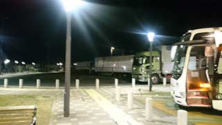 深夜の高速のサービスエリア。なぜか、ツアーを満喫した気分w いや、ツアートラックってあるでしょ。あれで移動している気持ちってやつです。しっかり鼻先ならべてます(笑)