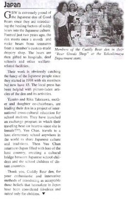 | 2002 | Spring(春号)、Summer(夏号) | 春号:アメリカのトラベリング・ベア「ギャラバントちゃん」の日本訪問 について掲載。(写真) 夏号;チャリティ・アークションについての記事。 |