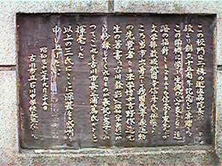 校門から片方医院を見てみます。中央左から横に流れるのが緒絶川です。右の写真はこの校門が遊佐外科の寄付により建てられたことを記載しているものであります。