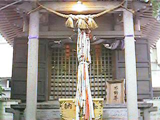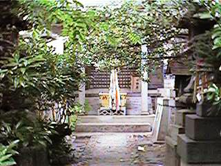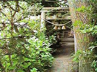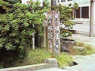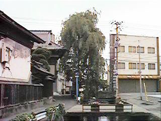 この支柱はおそらく当時県の観光課が奥の細道観光キャンペーンか何かで立てたもではないかと想像します。ここは丁度バイパスが出来た頃ですから,なるほどと勝手に頷いたりします。さて,右の写真が金毘羅様です。街のど真ん中とは思えないようなうっそうとした木々です。