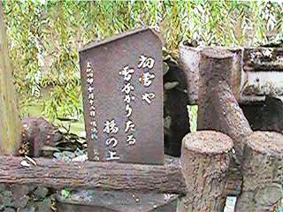 緒絶の館側から緒絶川を見ます。正面には柳の木が見えます。右の写真は右京太夫の句を復元したもの。本物を撮ろうとしたのですが,どこに消えたのか見えませんでした。或いは後ろの方に遠慮がちにある石がそれかもしれません。