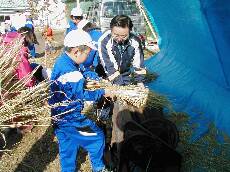 11月17日 地域の文化に親しむ会 学校の田んぼで刈り取った稲を、昔ながらの脱穀機で脱穀しました。足でペダルを踏みながら稲を次々と脱穀していきます。先生の助けを借りなくてもひとりで出来た誇らしげな顔。このお米は新年にお餅につきます。今はどこの農家でも使っていない昔の道具ですが、そんな文化も覚えておきたいですね。 |