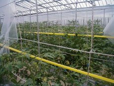 ハウス内に、ほとんどの列ごとに黄色いテープが張り巡らされています。