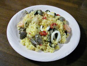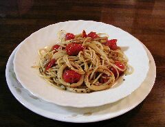 【作りかた】 1.スパゲッティを規定どおりの時間ゆでる。 2.ゆでている間にフライパンでオリーブオイルを熱し、にんにくをいため、イカとトマトを炒め、バジル(他のハーブでも)塩、こしょうで味付け。 3.スパゲッティが茹で上がったら、2.と混ぜてできあがり。 |