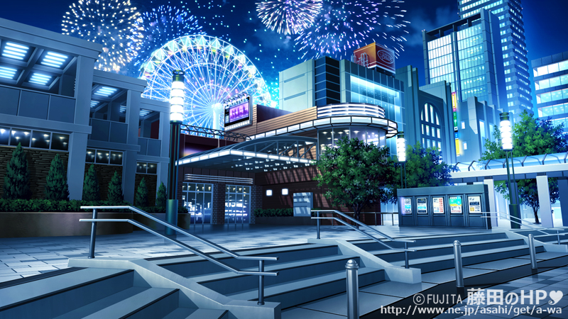 観覧車は、3Dならでは!微妙なカーブは省いておりますがそれっぽくなったかと。 色変えに関してですが、最初からそれ用に作るのと違って、昼の背景色を元に変更していくのは時間がかかります。 なので時間変えは…ぶっちゃけ苦手だったりします(^^;) み、皆さんどのように変更されてるのでしょうか。非常に気になります。 追記 この背景の花火は、自分で撮影した写真を合成しました。 毎年8月に行われる地元の長岡花火です。 にぎやかな背景になりました(^^)