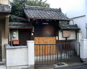 ![]() 本光寺山門と「伊東甲子太郎殉難碑」 門派石は現在寺内に移してある |