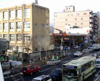 | 近藤妾宅 写真中央が「安寧小学校」。その向こうのガソリンスタンドとの間の通りが「木津屋橋通り」。 大きな通りは「堀川通り」。 近藤妾宅は丁度バスのいるあたりだろうか。 ここから出た伊東は木津屋橋通りで襲われたのである。 |