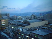 長野 左隣トップページのロールオーバーの画像。JR駅の後背は管平高原、松代方面であろうか。周囲を山々に囲まれた長野らしい光景が広がる。